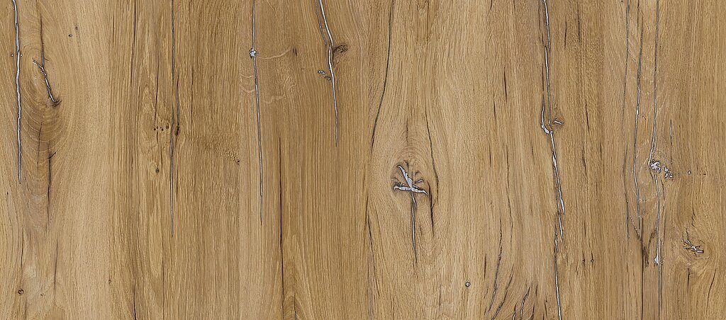 The RIVIERA OAK has a very natural appearance. Its harmonious overall picture shows many details that are very typical for oak. Pronounced silver grain and medullary rays, streaky and floral areas alternate and create a subtle plank pattern. The Riviera Oak works in both classic and modern kitchens. In the kitchen segment, it has established itself as one of our highlight decors since 2016, especially in honey color. Beautiful harmonies result here with the TORANO stone decor in classic black and white marbling.